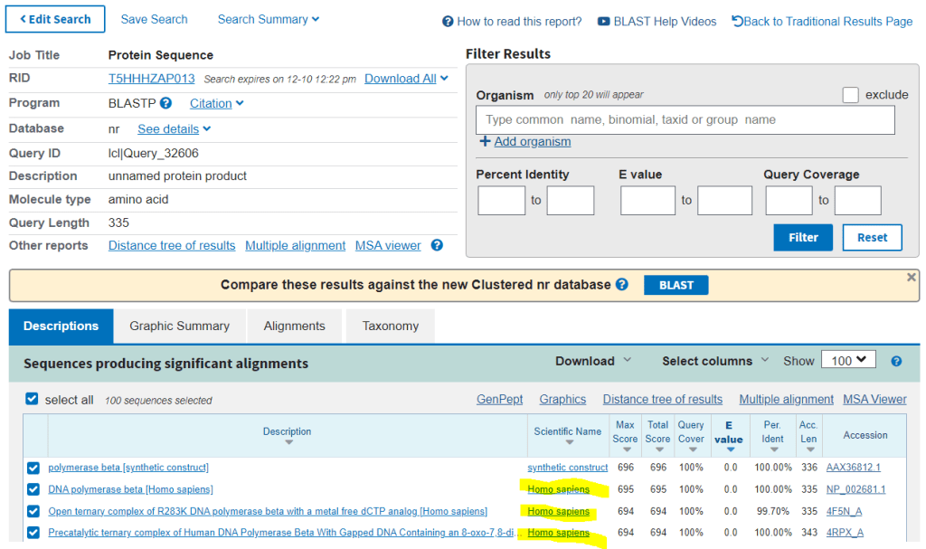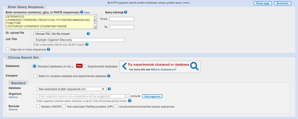 We will compare two gene sequences using BLASTp (Protein BLAST). This query will return list of sequences with strong alignment, allowing the most probable organism to be determined.